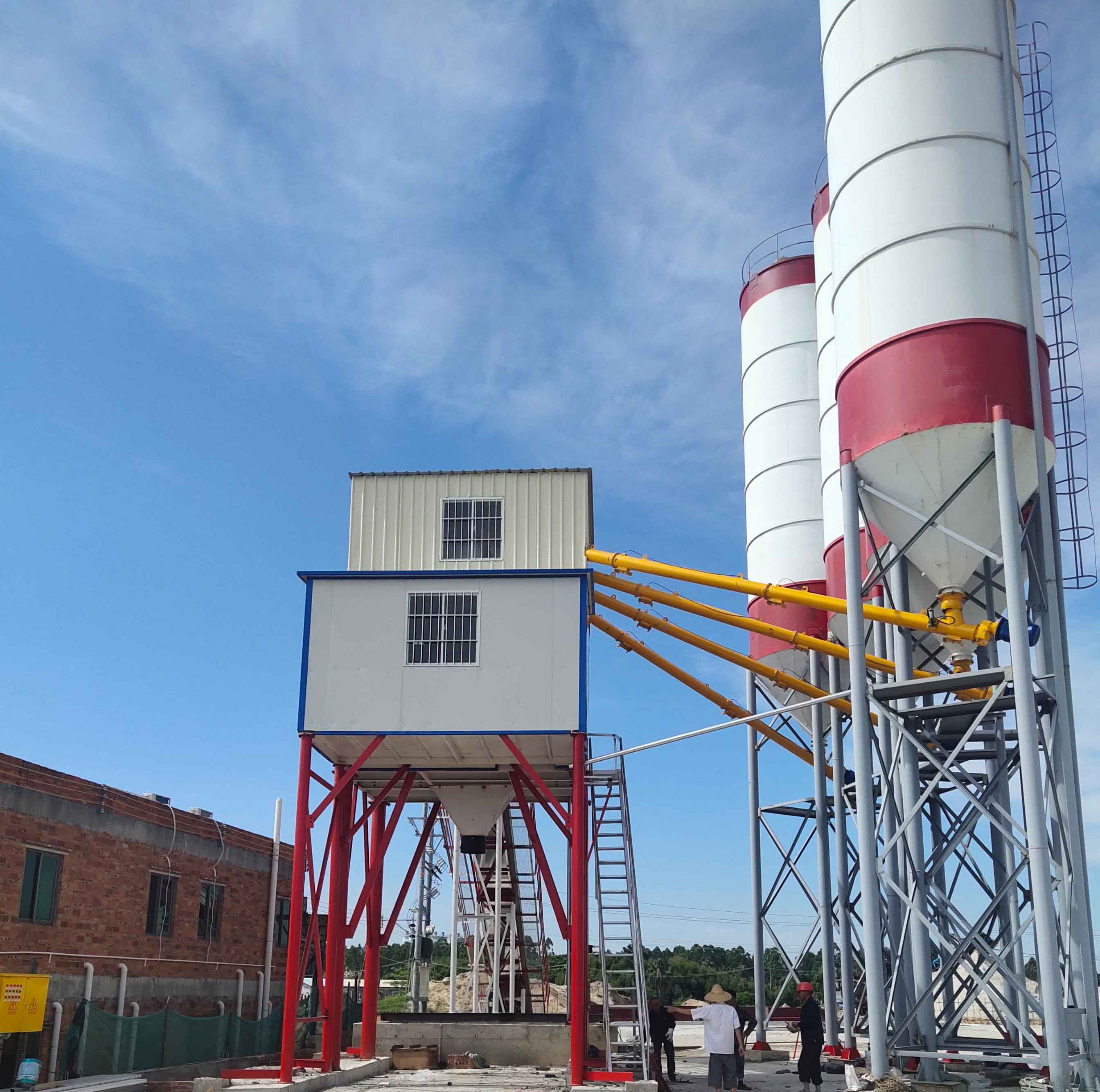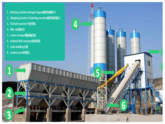 The main parts of concrete batching plant include:Twin-shift forced mixer,Three-hopper type batching machine, belt conveyor,Cement silo, screw conveyer,Water pot, additive pot,Powder scale hopper, water scale hopper, additive scale hopper and Control room.